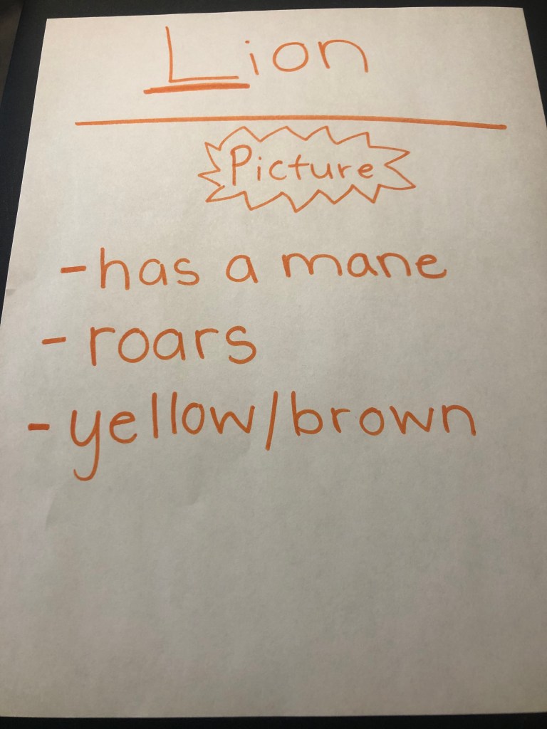 - Over the course of the week, take the time to write the animals from the book on a piece of chart paper that has the animals picture, underlining the beginning letter of the word, and write down characteristics of this animal along with pictures.