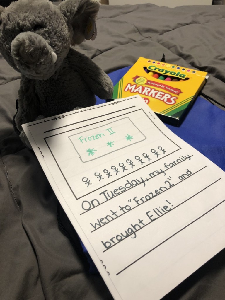 In a drawstring bag, there will be Ellie the Elephant, journal pages for the whole class, a pencil box filled with coloring utensils and pencils, and a parent letter describing how to help out their child with this assignment. One child a week will be given the bag and get the chance to bring it home. They get to bring Ellie with wherever they go. The child will then draw a picture and write at least one sentence on their favorite activity they did with Ellie. If appropriate, the parents can dictate what the child says. Ellie will need to be brought back by the Friday of that week so on Friday, they can share with the whole class their picture and what they did with Ellie. They can also take a picture with Ellie and bring it in to show the class as well. This works on the students writing skills as well as their oral speaking skills.